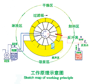 吸漿區(qū):工作時(shí)浸沒在料漿的過濾板在毛細(xì)作用下結(jié)合真空壓力,表面吸附成一層濾餅,濾液通過濾板進(jìn)分配閥至排液罐。