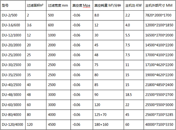 DU橡膠帶式真空過濾機參數(shù)表:(部分規(guī)格):